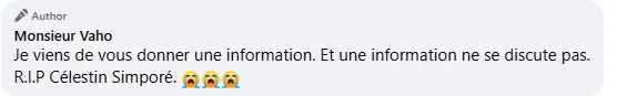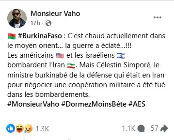 Dans la nuit du samedi 28 février 2026, la page Facebook dénommée Monsieur Vaho a écrit (ici) : « Burkina Faso : C’est chaud actuellement dans le Moyen-Orient… la guerre a éclaté… !!! Les Américains et les Israéliens bombardent l’Iran. Mais Célestin Simporé, le ministre burkinabé de la Défense qui était en Iran pour négocier une coopération militaire, a été tué dans les bombardements ». Après 17 h de temps, la publication a recueilli plus de 1 000 commentaires et 57 partages.
