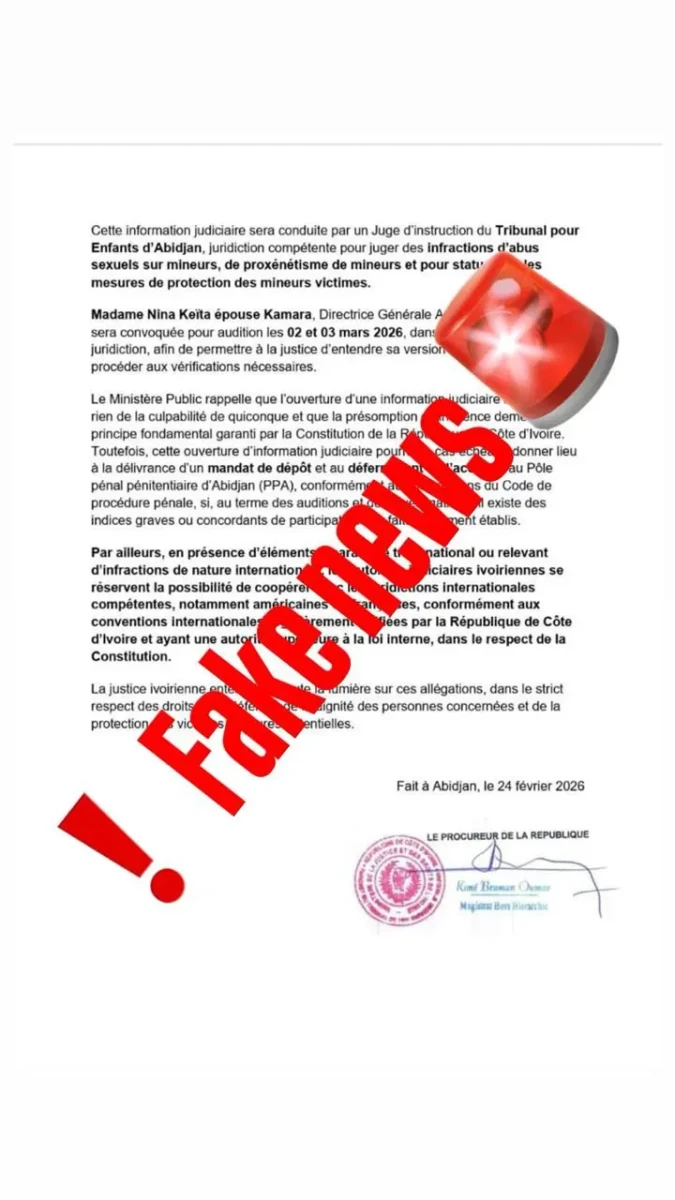 Selon le communiqué incriminé, le procureur de la République près le tribunal de première instance d’Abidjan a décidé de l’ouverture d’une information judiciaire contre Nina Keita. Dans le communiqué, il est précisé que cette prétendue enquête est ouverte au regard des faits graves liés aux atteintes sexuelles sur mineurs pour lesquels Jeffrey Epstein a été condamné.